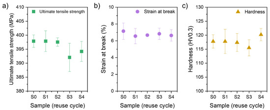 A similar consistence of results is found within mechanical properties and hardness. The difference between each series (S0–S4) is lower than the standard deviation of the results. Even if the error is neglected, the determined mean values are within 5 MPa for the UTS, 0.5 p.p. for the break at strain, and 5 HV0.3 for the hardness.