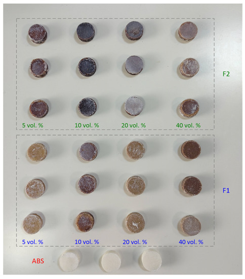 Figure 3 depicts all samples produced using neat ABS and ABS–microsphere composites. Cylindrical samples with 20 mm diameter and 16 mm height were produced using fillers F1 and F2 in different proportions in triplicate.