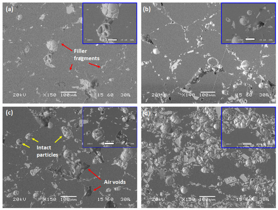 The sample with minimum filler content (Figure 4a, 5 vol.%) presents few intact filler grains. With respect to the spherical particles, filler fragments dispersed along the composite matrix were identified; these may coexist in the filler or be produced during preparation of the composite sample through compression molding. Air voids can be observed, mainly in the vicinity of the filler, although dispersed along the ABS matrix as well. More intact filler particles are identified with an infill ratio of 10 vol.%, with a parallel increase in the presence of fragments (Figure 4b). Elongated air voids are present, which are randomly oriented. The presence of grain fragments in the air void might denote that the voids are attributed to the collapse of the filler, probably during compression molding. More air voids can be identified in the sample with a filler content of 20 vol.% (Figure 4c). Many intact particles of various sizes can be identified in the sample. Filler clusters are present without affecting the dispersion homogeneity on the macroscopic level. The size of the air voids is similar to those seen in the sample with 10 vol.% filler. The sample with maximum filler content (Figure 4d, 40 vol.%) presents a dense network of microspheres which are well dispersed along the ABS matrix. With respect to the spherical microspheres, compact particles of irregular shape were identified. Such particles constitute either inadequately expanded perlite particles or non-expandable particles with a high proportion of biotite, quartz, and/or plagioclase. It is worth noting that no air voids could be identified in this case.