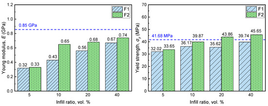 Young’s modulus and yield strength of samples prepared using different proportions of F1 and F2 fillers. Horizontal dashed blue lines denote respective property value for sample prepared solely with ABS.
