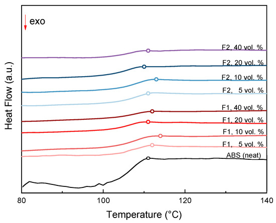 The thermal behavior of the obtained composites and the reference ABS material was studied through Differential Scanning Calorimetry at a heating rate of 10 °K/min under a nitrogen atmosphere. The obtained diagrams are depicted in Figure 7 for composite samples with different ABS–filler compositions and for the reference ABS sample.