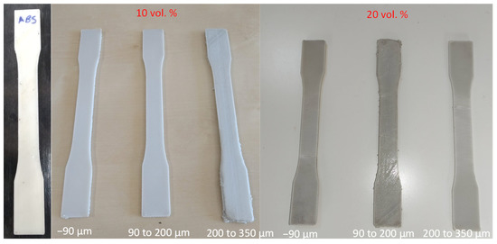 The studied properties of the filaments produced in a single screw extruder using neat ABS and various ABS–filler combinations are presented in this section. The filaments were subsequently used to construct dogbone samples appropriate for mechanical properties studies by employing the FDM 3D printing method. Corresponding results are presented in this section. In particular, −90 μm, 90–200 μm, and 200–350 μm granulometric grades of F3 type filler were used in proportions of 10 and 20 vol.% for the preparation of the composite filaments.