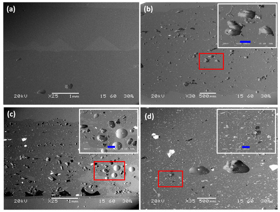 SEM of cross-sections of 3D printed dogbone samples constructed using: (a) neat ABS filament (×25), (b) composite filament with 10 vol.% of −90 μm microspheres (×30), (c) composite filament with 20 vol.% of 90–200 μm microspheres (×25), and (d) composite filament with 20 vol.% of 200–350 μm microspheres (×35). Detailed view of surface enclosed by the red rectangle is shown at the top left of (b–d) images. Length of blue bar is 100 μm.