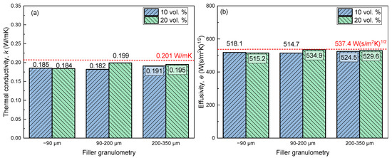 The thermal conductivity and effusivity of 10% and 20% v/v expanded ABS/perlite composite samples are depicted in Figure 11a,b for various filler granulometries.