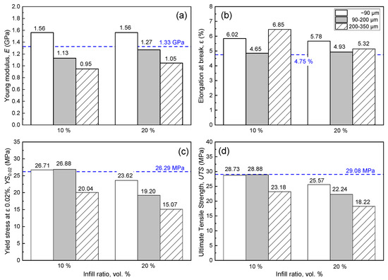 The use of the finest filler (<90 μm) allows for printing of dogbones with a higher Young’s modulus compared to the sample produced using neat ABS, resulting in an increase in the Young’s modulus by = 15.8–17.3% (Figure 12a). However, this was not the case when 90–200 μm and 200–350 μm fillers were used, which present lower Young’s modulus values compared to that of the neat ABS. The elongation of dogbones before breakage occurred is higher than the benchmark for 10 and 20 vol.% infill ratios (Figure 12b). The sample with coarse filler and minimum infill ratio presents the highest elongation at break (6.85%). Regardless of filler size, a systematic reduction in elongation at break is observed with increasing infill ratio. As was expected, the same trend is observed for the yield stress at elongation of 0.02% (Figure 12c). The use of composite filament with a filler size of 90–200 μm and 200–350 μm allows for printing of dogbone samples having practically the same yield stress at 0.02% elongation as the sample printed using neat ABS filament at a 10 vol.% infill ratio. A significant reduction of yield stress is identified for the coarser filler in all infill ratios, while for the maximum one (20 vol.%) the value is reduced by 42.7% (15.07 MPa) compared to the benchmark (26.29 MPa). Ultimate tensile stress constitutes another property that is adversely affected by the infill ratio, as revealed by the data presented in Figure 12d. The maximum ultimate tensile strength is observed for dogbone samples produced using filament with the minimum infill ratio (10 vol.%) and size <90 and 90–200 μm, while further increasing their content in filler causes systematic reduction of the ultimate tensile strength of the printed dogbone samples. Similar to the yield stress at 0.02% elongation, dogbone samples printed using filament with filler grade of −90 μm and 90–200 μm and 10 vol.% infill ratio obtained ultimate tensile stress that is practically the same as that of dogbone samples produced using neat ABS filament.