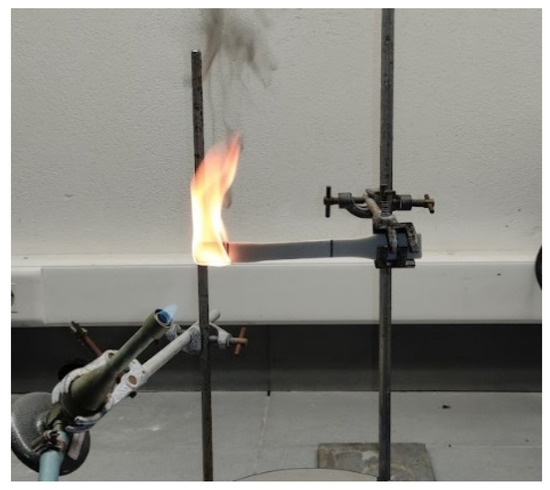The samples’ thicknesses, as well as the critical data obtained by subjecting three samples to the implemented flammability tests, are tabulated in Table 3. Moreover, a snapshot during experimental procedure is provided in Figure 13. For samples produced using composite filament, the filler diameter was <90 μm. All three samples fall into the HB category, presenting similar burning rates. Among all samples tested, the minimum linear burning rate was observed for the sample produced using composite filament with a 20 vol.% infill ratio.