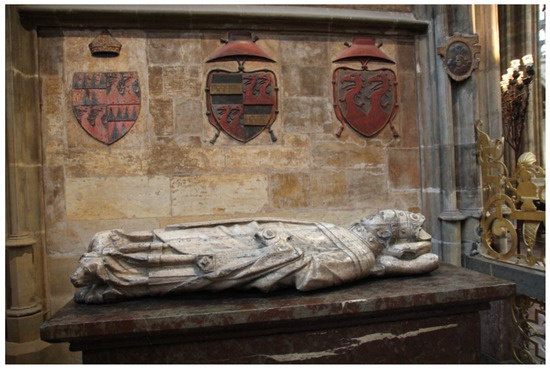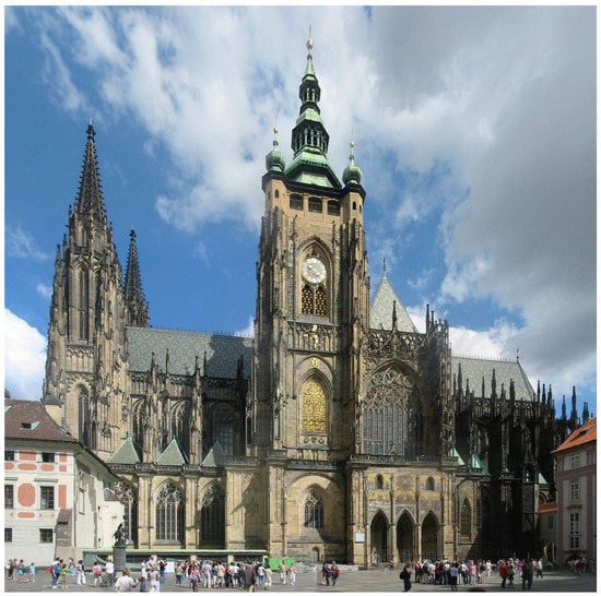 3]. Statues and coats of arms on the triforium have not yet been studied, despite their undeniable artistic significance. The coats of arms and murals in the Vlašim Chapel in St. Vitus Cathedral have also not been examined. The sculptural work of the second builder of the cathedral, Petr Parléř (1356–1399), was the source of inspiration for the so-called “Beautiful Style” (Weicher Stil), which influenced the whole of central Europe, including Prussia, Silesia, and Austria. Thanks to its beautiful style, Prague remained until the end of the 14th century at the forefront of European art.