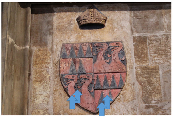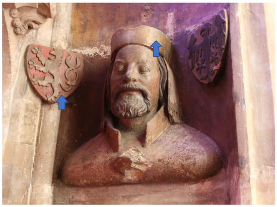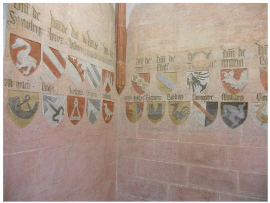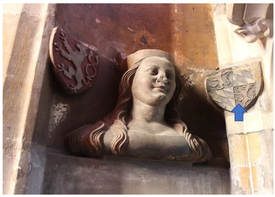 Figure 11). According to the dating, Charles IV had the decoration created in 1361, after the birth of his son Wenceslas IV. The same pigments were used at Lauf Castle as in St. Vitus Cathedral 20 years later. However, most of the painting on Lauf Castle has been damaged and most of the coat of arms have already been repainted.