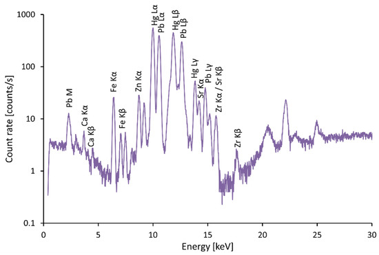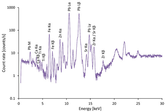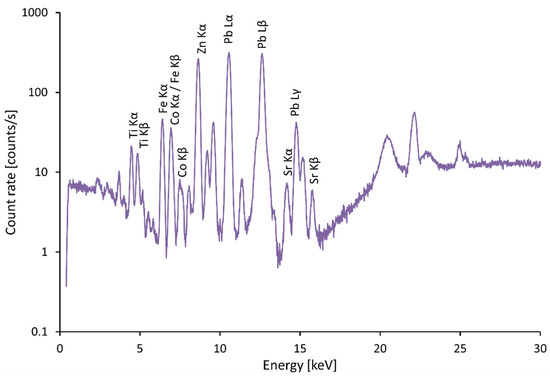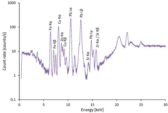 The analysis was performed non-invasively using the “Main” mode with a spot diameter of 8 mm, an Al/Fe filter, 50 kV X-ray tube voltage, and current of 40 μA. The measurement time was 30 s with a sample device distance of 5 mm. The measurement was performed contactless, and there was no possibility of damaging the object. The non-painted material was measured prior to the analysis to recognize background elements present in the analyzer (shielding, Ag anode, filter) and in the non-painted material. Device calibration was performed automatically.