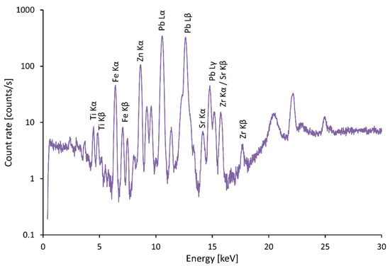 Apart from the peaks indicated in the spectra, the effect of the Al/Fe filter and the detection of backscattered radiation could be observed as a signal decrease between 5 keV and 16 keV. In addition, peaks that originated in the device, such as the Ag characteristic and Compton-scattered radiation around 20–25 keV, are not indicated in the spectra. These peaks and effects can be observed in all presented spectra.
