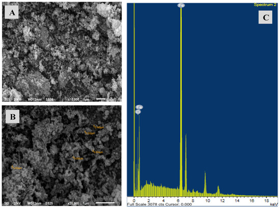 SEM micrographs at two different magnifications (A,B); EDX analysis of the prepared ZVI nanoparticles at optimum conditions (C).
