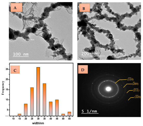 TEM images at different magnifications (A,B); histogram of the nanoparticle width (C); and SAED image (D)of nZVI sample.