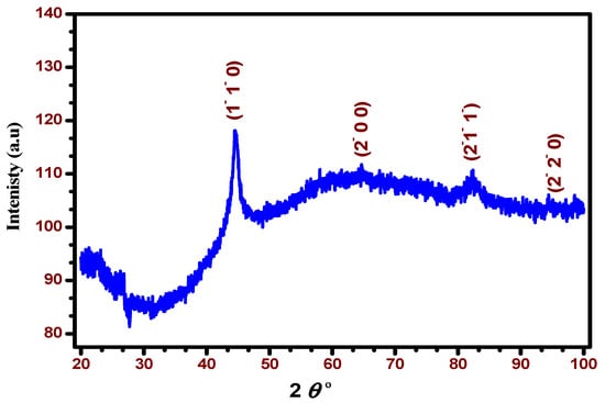 The XRD pattern of the synthesized zero-valent iron nanoparticles at the optimized conditions is exhibited in Figure 3. The figure demonstrates four main spectral signals that are attributed to zero-valent iron of different phases that appeared at two theta angles of 44.67, 65.018, 82.327, and 98.94°.