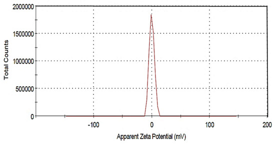 Zeta potential is an effective tool for assessing the intensity of electrostatic attraction or repulsion between particles in a suspension. Furthermore, it is a key variable in examining the stability of nano-sized particles in aqueous environments. Nanoparticles with zeta potentials larger than +30 mV and lower than -30 mV are considered stable for liquid suspension without steric stabilization. However, in non-colloidal suspensions, this value can be altered [27]. The ZVI nanoparticles’ stability was assessed here with a zeta potentiometer after synthesizing the metal nanoparticles (Figure 4). The observed zeta potential for the suspended nZVI is found to be 0.288 mV. This value indicates that the ZVI is in the range of nano-sized particles, as confirmed by XRD, SEM, and TEM analysis and its stability.