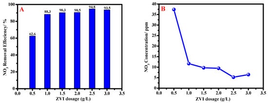 Nitrates removal efficiency versus the dosage of nZVI (A) and Nitrate concentration after treatment with different ZVI dosages (B) at ambient temperature and 30 min contact time.