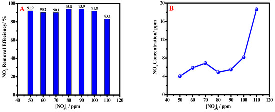 The effect of nitrate concentration on the removal efficiency of nZVI has been investigated to detect the maximum removal capacity for the studied material, as shown in Figure 6. Here, 1.0 g/L of nZVI dosage was used, and nitrate’s initial concentration varied from 50 to 110 ppm. It can be noted from Figure 6A that the efficiency of nitrate removal ranges between 90.0 and 94.0% for all concentrations except that of 110 ppm, at which it reaches 83.0%. This can be attributed to the covered active sites decreasing the capacity of the nZVI. However, the obtained values of the remaining nitrates after treatment are still below the maximum value of nitrate concentrations of the WHO, even if using small dosages.