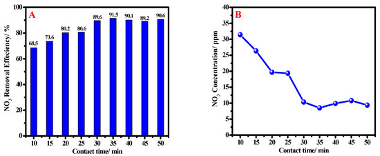 From Figure 7B, it is observed that, with increasing of the contact time, the nitrate removal efficiency is increased until reaching 91.4% at minute 30. Then, there was no noticeable change after minute 50. This means that all active sites were occupied and saturated at 30 min and confirms the fast removal process favorable for industrial and commercial purposes.