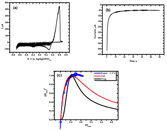 (a) Cyclic voltammetry of Ag, Pt, and Co ions as shown, (b) chronoamperometric behavior at Ed = −0.60 V, and (c) (I/Imax)2 vs. (t/tmax) relationship for experimental and theoretical data of the instantaneous and progressive crystal growth.