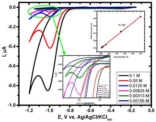Figure 9 shows cyclic voltammograms of the modified GCE with AgPtCo immersed in a solution consisting of 0.1 M NaOH as a supporting electrolyte scanned within the range of −0.15 to −1.20 V at a scan rate of 50 mV/s at different concentrations of nitrate ions as labeled in the figure.
