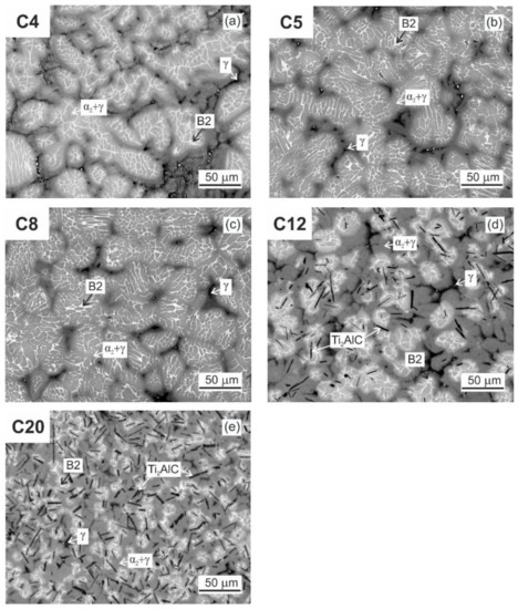- The Vickers hardness increases with the increasing content of C in the as-cast alloys. The elastic modulus of the C20 alloy with 5.4 vol.% of primary Ti2AlC particles is higher than that measured in the C4, C5, C8, and C12 alloys.