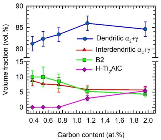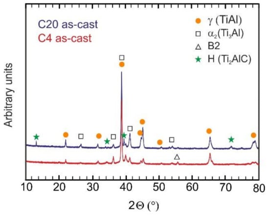 Figure 4 shows the typical microstructure of the as-cast C4, C5, C8, C12, and C20 alloys. The microstructure of the as-cast alloys is dendritic, as shown in Figure 4a–e. Within the dendrites, a bright network of the B2 phase results from the solid-state phase transformation of the β phase to the α and reordering of β to B2 at lower temperatures [55,56,57]. The α phase transforms into a fine lamellar α2 + γ microstructure and a low amount of a single γ phase can be preserved in the interdendritic region. This type of microstructure is typical for as-cast TiAl-based alloys, containing additions of Nb, Ta, Mo, and W [58,59]. However, the microstructure of the as-cast alloys shows significant changes with increasing carbon content. Figure 5 shows the typical XRD diffraction patterns of the C4 and C20 alloys, indicating the presence of four phases: γ, α2, B2, and H-Ti2AlC (in C20 alloy). Besides the C20 alloy, the formation of plate-like Ti2AlC particles is also identified in the C12 alloy, as shown in Figure 4d. Figure 6 shows the microstructure in the interdendritic region of the C4 and C20 alloys. In both alloys, the interdendritic region is composed mainly of the γ phase and a small amount of lamellar α2 phase, as shown in Figure 6a,b. Table 2 summarises the measured chemical composition of the individual phases and microstructural regions in the as-cast alloys. The individual phases and regions in the C4, C5, C8, C12, and C20 alloys do not show significant differences in the content of Ti, Al, and W. Figure 7 shows the dependence of the volume fraction of individual phases and microstructural regions on carbon content. The volume fraction of the B2 phase decreases from 10 vol.% to 4 vol.%, with increasing carbon content from 0.38 to 1.96 at.%. The same tendency is also observed for the volume fraction of the interdendritic α2 + γ region, which decreases from 8.8 vol.% to 6 vol.%. The volume fraction of dendritic lamellar α2 + γ regions increases with increasing carbon content from 81 vol.% to 85 vol.% with increasing carbon content from 0.38 to 1.96 at.%. It should be noted that the carbon content affects interlamellar α2-α2 spacing, which decreases with increasing carbon content up to a solubility limit of carbon in TiAl-based alloys [54]. The volume fraction of plate-like primary Ti2AlC particles increases from 2.9 vol.% to 5.4 vol.% with increasing carbon content from 1.15 to 1.96 at.%. As shown by Lapin et al. [23], the volume fraction of primary Ti2AlC particles depends on the carbon content and increases linearly with increasing carbon in Ti-44.5Al-8Nb-0.8Mo-0.1B-xC (at.%) alloys.