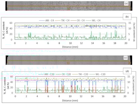The segregation behaviour of the alloying elements and the chemical homogeneity of the as-cast ingots was assessed by the EDS line analysis with a step of 40 µm (500 points). Figure 8 shows the measured variations in the alloying elements with the illustration of the positions of the analyzed points at the transversal sections of the as-cast C4 and C20 ingots. Significant dendritic segregation can be observed in the sample C4 at first glance. The contents of Ti and Al in the C4 ingot vary from 50 to 53 at.% and from 44 to 47 at.%, respectively, as seen in Figure 8a,b. The most significant segregation is associated with a decrease in the content of Ti to 46 at.%. For Al, the most pronounced segregation is associated with the increase in the content of Al to 54 at.% in several analysed points, which is associated with the presence of an interdendritic single γ phase in the microstructure. The formation of the interdendritic γ phase in the as-cast alloys can be explained by the microsegregation behaviour of the alloying elements. Aluminium characterized by the partition coefficient of kAl = 0.9 segregates preferentially into interdendritic liquid during solidification [60,61]. Locally, the last liquid enriched in Al solidifies through the formation of a single γ phase, as seen in Figure 4a–d [4,54]. It is important to note that O (kO = 1.29) behaves similarly to Ti (kTi = 1.14) or W and segregates into the dendrites [60,61]. The EDS line analysis of the C20 ingot shows more pronounced segregation, with the opposite tendency associated with an increase in C content up to 26 at.% and a decrease in Al content to 25 at.%, as shown in Figure 8c,d. These segregation peaks result from the presence of the Ti2AlC particles in the microstructure. The content of W in both analyzed samples is relatively stable (1–3 at.%), and more pronounced segregation is caused by the occurrence of the B2 phase enriched in W and interdendritic γ phase enriched locally in Al. A significantly lower occurrence of larger interdendritic regions containing a single γ phase and chemically more homogenous structure of the intermetallic matrix indicates a change in solidification behaviour of the C20 alloy, which will be discussed later.