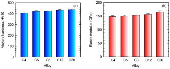 Vickers hardness and elastic modulus of the as-cast C4, C5, C8, C12, and C20 alloys: (a) Vickers hardness HV10; (b) Indentation elastic modulus. The studied alloys are marked in the figure.