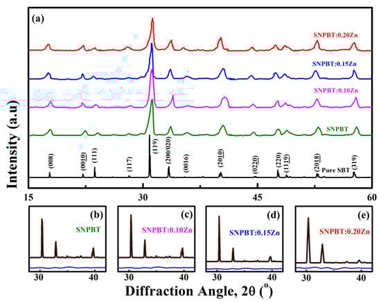 In Figure 1a, a XRD comparison of pure SBT, pure SNPBT, and SNPBT:xZn (x = 0.10, 0.15, 0.20) ceramics is illustrated to optimize the effect of the Zn2+ addition in the reported SNPBT. It is evident from Figure 1 that all ceramic samples have maintained their single orthorhombic phase, with A21am space group structure and patterns matching well with the standard PDF Card # 43-0973 [19,27]. All XRD patterns have not shown any impurity or extra peaks, indicating that the additive Zn-ions have been incorporated into the crystal lattice of SNPBT. (119) is the strongly intense diffraction peak of pure SBT (for m = 4 of general BLSF formula) around the diffraction angle of 30o, which is known to occur at (112m + 1) [28,29]. A similar trend has been observed for the pure SNPBT and SNPBT:xZn ceramics. It is clear from the XRD analysis that the addition of Zn2+ for Sr2+ and Bi3+ has not shown a strong impact on the phase formation, but a slight shifting of the maximum intense (119) peak towards the higher angle is observed. The type of compressive stress influenced by the additive Zn2+ ions (with lower ionic radii) has not affected the lattice parameters of SNPBT symmetry (with larger ionic radii Sr2+, Na+, Bi3+) [30,31], which is only possible if a lesser amount of the additive has been incorporated in the lattice site. Herein, it can be concluded that the additive (lesser content) has been incorporated successfully into the lattice without damaging the crystal structure. Higher substitutions usually result in heavy lattice distortions and occasional local phase formations or even the change of the space group. However, here it is not the case, as the ceramics have maintained their structure. The XRD patterns of SNPBT:xZn (x = 0, 0.1, 0.15, 0.20) ceramics were simulated with the Rietveld method by using Material Studio (Figure 1b–e). A high symmetric orthorhombic A21am space group structure was treated as the reference structure for the simulation. Two standard parameters of the Rietveld simulation are Rwp and Rp, which remained less than 6% and 4% for all simulated samples, confirming that ceramics have maintained their structure even after the incorporation of the Zn2+ ions at the lattice sites of SNPBT.