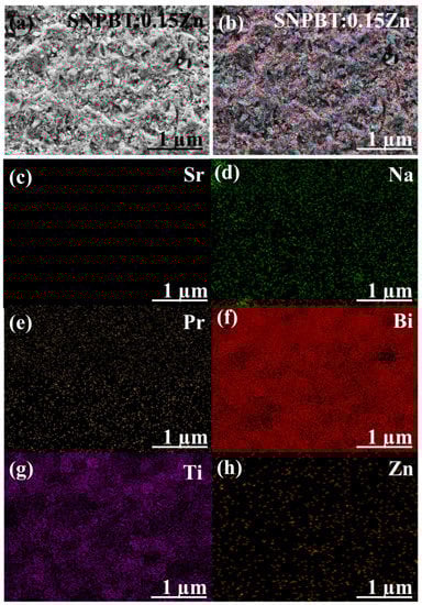 The visual compositional elemental analysis of typical 2D elemental mapping is shown in Figure 2a–h. Here, an SEM image of SNPBT:0.15Zn ceramic is presented in Figure 2a, where uniformity of the grain size 1–2 μm is observed. This refinement of the grain size has been achieved due to the addition of Zn-ions at the A-site of SNPBT lattice, which has not only reduced the lattice diffusivity [32] but also resulted in no visible holes or cracks in the ceramic. The combined elemental distribution of all involving elements of SNPBT:0.15Zn is shown in Figure 2b. In Figure 2c,d, a high degree of dispersion in the 2D elemental mapping of Bi and Ti is visible, depending upon their high stoichiometric ratios in SNPBT:0.15Zn ceramic. On the contrary, a lower dispersion degree of Sr, Na, Pr and Zn (Figure 2e,h) endorses the lower stoichiometric ratio of the elements in the SNPBT:0.15Zn chemical formula. Figure 2h shows that Zn2+-ions are uniformly distributed throughout the ceramic, which is a clear indication of the incorporation of the Zn2+-ions at the lattice sites of the SNPBT host. In other words, Zn2+-ions have segregated at the grain boundaries of SPPBT. The high relative density of SNPBT:0.15Zn ceramic is ~96%, which points out that the addition of Zn has overcome the vacancies created by the evaporation of Bi components at high-temperature fabrication and made the sample compact for thermal and electrical measurements.