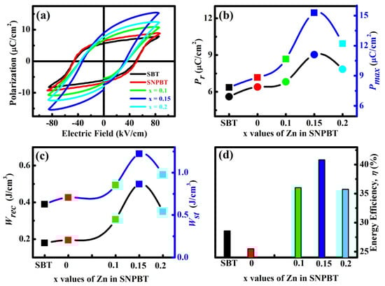 where Pmax, Pr, and E are the maximum polarization, remanent polarization, and electric field, respectively [35]. In Figure 3b,c, the energy storage properties (Wst, Wrec, and ) are calculated and plotted versus the x values of Zn in SNPBT at the applied electric field of 80 kV/cm. The Wrec of all the samples is above 0.2 J/cm3 (0.2–0.5 J/cm3) and the efficiency is above 25% (25–41%). The highest Wrec of 0.5 J/cm3 with high energy efficiency (41%) is achieved in the SNPBT:0.15Zn ceramic.