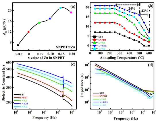 The maximum value of the piezoelectric coefficient (d33 ~ 21 pC/N) has been achieved in the SNPBT:0.15Zn ceramic sample as compared to pure SBT (7 pC/N) and SNPBT (12 pC/N) (Figure 4a). Figure 4a is the piezoelectric coefficient (d33) versus xwt%Zn addition in SNPBT and pure SBT (for comparison) measurements taken at room temperature. All the ceramic samples were polarized at 120 °C under a high DC electric field of 150 kV/cm. To further confirm the thermal stability of the d33 value, the degradation of polarization in the ceramics is observed after annealing the samples at different temperature ranges (20–600 °C) for 30 min; the retained d33 at room temperature is depicted in Figure 4b. The d33 value of pure SBT has reduced from 7 pC/N (room temperature) to 2 pC/N (at 500 °C) due to the well-known thermal depoling effect. Similarly, the value of d33 for pure SNPBT has remained strong at 5 pC/N at 500 °C due to the high Curie-temperature (623 °C) of the ceramic [19]. However, the piezoelectric coefficient of SNPBT:0.15Zn ceramic is the most stable, with a 24% decrement in the d33 value at 500 °C (16 pC/N) as compared to its room temperature value (21 pC/N). During the annealing process, ceramics transit from an aligned domain structure to a randomized domain structure is a natural phenomenon. When the external poling field is removed, the depolarization field tends to perform the complete back-switching of the domains in the ceramics at the diffusion temperature. During the poling process, the applied external poling field was the reason for creating the alignment of ferroelectric domains in pure SNPBT grains and unbound misfit compensation charges at SNPBT/SNPBT grain boundaries. The additive ZnO particles (naturally semiconducting) have occupied those unbound misfit places, which has resulted in the further growth of mobile electronic charge distribution over the SNPBT grain boundaries. So, the depolarization field, to some extent, is compensated by the charges introduced by ZnO. Consequently, after the removal of the external poling field, SNPBT grains have maintained their poled states and will reduce the back-switching effect. Insofar as the behavior of ZnO is important, it is considered that ZnO will contribute its semiconductor nature to ensure that it will behave as a charge pool, so as to reduce the piezoelectric degradation behavior [36]. The value of d33 will start to reduce for SNPBT:0.20Zn ceramic (19.3 pC/N), as the solubility limit of Zn in SNPBT has reached (Percolation threshold); afterward, Zn ions will start to gather at the grain boundaries of SNPBT counterpart, affect the piezoelectric degradation, and produce the internal bias field [1,9]. In such a case, the excess of Zn-ions with a semiconductor nature will be the reason for high conductivity and the degradation of d33.
