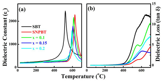 The thermal stability of the high piezoelectric coefficient in materials can direct the sensitivity of the device to be utilized in high-temperature piezoelectric devices. Similarly, the thermal stability of d33 will not only describe the strength of the material but also the efficiency of the material under applied high temperatures. The Curie temperature (TC) of materials plays a vital role, as materials lose their complete piezoelectric and ferroelectric properties at a specific TC. The dielectric constant (ɛr) versus temperature plots of pure SBT, SNPBT, and SNPBT:xZn ceramics (x = 0.1, 0.15, and 0.2) are shown in Figure 5a for the temperature range of 0–700 °C, measured for the frequency 100 kHz, where pure SBT has shown the highest ɛr ~ 2320 at the TC ~ 521 °C, consistent with previous reports [37]. The pure SNPBT ceramic has shown the ɛr ~ 2205 at the highest TC of ~ 626 °C, which is similar to already reported information [19]. The addition of small content Zn2+-ions in the SNPBT counterpart (SNPBT:xZn) has resulted in little degradation in the values of ɛr and TC, as compared to pure SNPBT. SNPBT:0.10Zn, SNPBT:0.15Zn, and SNPBT:0.2Zn have given the ɛr values of 2160, 1786, and 1580 at the TC values of 612 °C, 605 °C, and 593 °C, respectively. Here, it is notable that SNPBT:xZn (x = 0.10, 0.15, 0.20) ceramics have shown a high TC, even much higher than pure SBT, which is the specific reason for getting the high d33 values of the ceramics even after 500 °C. The achieved result clearly demonstrates the importance of the material to be utilized in multifunctional devices at such high temperatures. Dielectric loss versus frequency graphs of pure SBT, SNPBT, and SNPBT:xZn ceramics (x = 0.1, 0.15, and 0.2) are plotted in Figure 5b, which shows the very low values of dielectric loss for all ceramic samples even at the high temperature of >500 °C, which is an indication that the Zn-ions have successfully incorporated at the lattice sites of the structure without creating any destruction. Second, Zn-ions have also occupied the vacancies, which were generated by the evaporation of Bi or oxygen counterparts, confirming the strength and compactness of the ceramics for such a high temperature and high frequency.