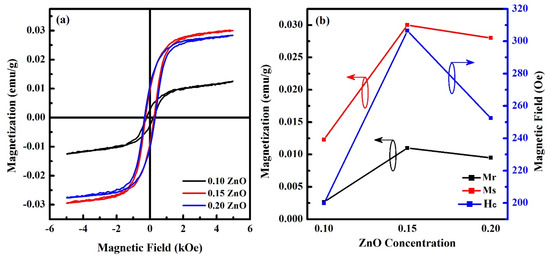 In Figure 6, the magnetization versus magnetic field measurements of SNPBT:xZn (x = 0.10–0.20) ceramics are taken at room temperature and show the weak ferromagnetic behavior. The increment in saturation magnetization was seen as the ZnO concentration was increased, indicating that the addition of ZnO to the SNPBT ceramics improves their ferromagnetic behavior. The highest saturation magnetization (Ms) of 0.028 emu/g with a low coercive field of 306 Oe was observed for SNPBT:0.15Zn. The weak ferromagnetism is related to the presence of the magnetic interactions of ZnO and uncompensated magnetic spin configurations in SNPBT ceramics. Furthermore, as described earlier in the SEM analysis (Figure 2h), Zn2+-ions are uniformly distributed throughout the ceramic surface, and few are segregated at the SNPBT/SNPBT grain boundaries, which is the reason for generating a huge number of uncompensated surface spins, resulting in a long-range ferromagnetic order [38].