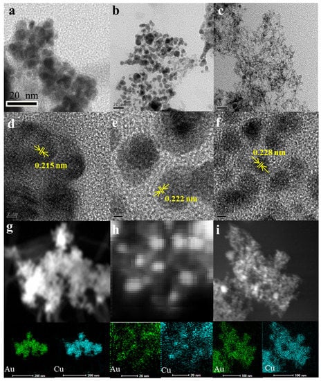 TEM and HR-TEM images of the AunCu100−n NPs samples. Au25Cu75 (a,d), Au50Cu50 (b,e) and Au75Cu25 (c,f) with lattice fringes and corresponding facets indicated. EDS element mappings of Au25Cu75 (g), Au50Cu50 (h) and Au75Cu25 (i).