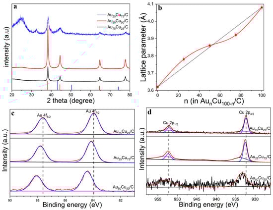 (a) XRD patterns of Au25Cu75/C, Au50Cu50/C and Au75Cu25/C. (b) Dependence of the lattice parameters for the AunCu100−n NPs samples on the relative composition of Au%. (c) Au 4f XPS spectra of Au25Cu75/C, Au50Cu50/C and Au75Cu25/C. (d) Cu 2p XPS spectra of Au25Cu75/C, Au50Cu50/C and Au75Cu25/C.