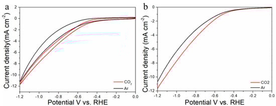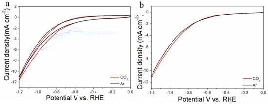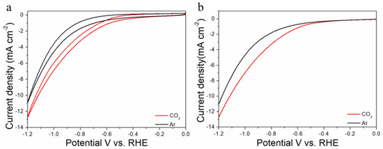 Cyclic voltammograms (a) and linear scan voltammograms (b) of Au50Cu50/C in Ar saturated and CO2-satruated 0.1 M KHCO3 solutions collected at a scan rate of 20 mV s−1.