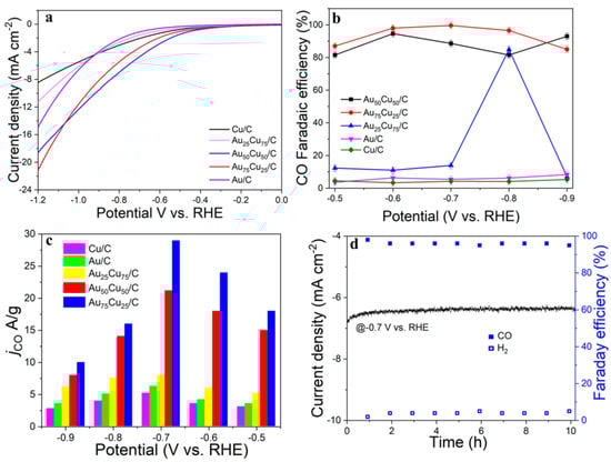 Performances of the Au25Cu75/C, Au50Cu50/C, Au75Cu25/C electrocatalysts for CO2 reduction with Cu/C and Au/C as controls. (a) The LSV in 0.1 M KHCO3 electrolyte saturated with CO2. (b) Faradaic efficiencies (%) at applied potential ranging from −0.5 V to −0.9V vs. RHE. (c) CO2 reduction current density (jCO) with all the carbonaceous products taken into account. (d) Stability test and FE(%) of CO and H2.