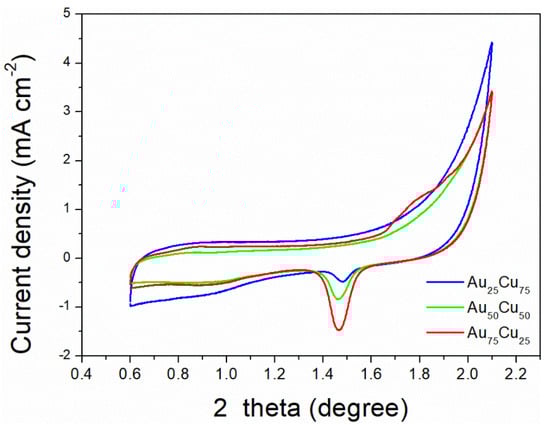 The ECSA of Au25Cu75/C, Au50Cu50/C and Au75Cu25/C. Cyclic voltammograms in 50 mM H2SO4, scan rate 50 mV s−1.