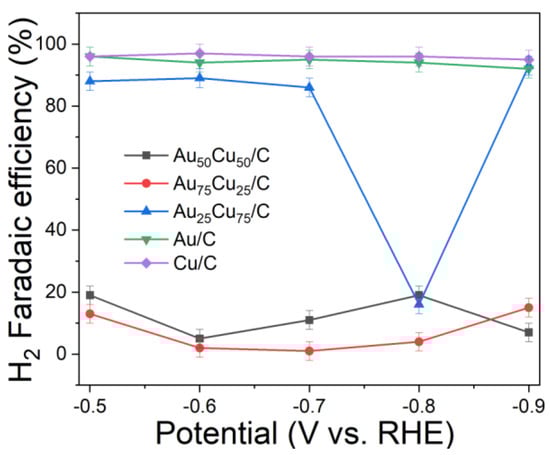 The H2 FE of Au25Cu75/C, Au50Cu50/C and Au75Cu25/C, Au/C and Cu/C.