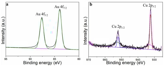 Stability is an important indicator with which to evaluate the performances of electrocatalysts. The stability of Au75Cu25/C was tested by the timing current method (i–t), and the gas products were detected with an online gas chromatograph every hour for 10 h (Figure 6d). In the reaction process for 10 h, the catalytic activity of Au75Cu25/C catalyst for CO had no obvious attenuation, and FECO remained above 90%. This indicates that Au75Cu25/C maintained good catalytic activity and selectivity for CO in the CO2RR process, and could keep stable. The results show that alloying caused changes in lattice parameters between catalysts which affected the performance of the catalysts for the CO2RR. In order to further prove that Au75Cu25/C catalyst has good stability, XPS was used to characterize the Au75Cu25/C catalyst after electrolysis. XPS results show that Au75Cu25/C retained its original composition after a long period of electrolysis (Figure 11). In the process of electroreduction for CO2, Au and Cu cooperated with each other to form an alloy and showed high catalytic activity and selectivity for CO. Meanwhile, the unique nanostructure of AunCu100−n alloy could reduce the adsorption of CO on the surface and increase the yield of CO. The high selectivity of this gas product makes the separation process relatively simple, which is beneficial for practical applications.