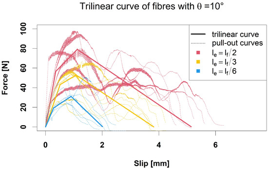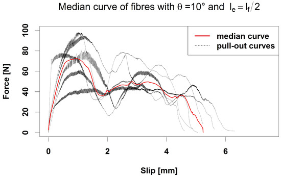 For fitting the model, the force and slip values derived from the six fibre-pull-out tests per combination ( θ , l e ) are averaged. We use the median values
