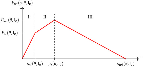 In the next step, we fit a piecewise linear model to the observed force–slip curves. In the literature, several approaches (bilinear, trilinear, exponentially decreasing) for modelling single-fibre pull-out curves have been suggested, see [31]. Based on the results of our single-fibre pull-out tests, we decided to use a three-phase model. Phase I represents the linear elastic part of the curve up to the yield strength P e l that is reached at slip s e l . Phase II is the nonlinear part up to the ultimate force P u l t at slip s u l t . For simplicity, this part is also described by a linear model. Phase III is a linear descending branch up to complete fibre pull-out at slip s t o t , i.e., the last recorded slip value. See Figure 2 for an illustration of the model.