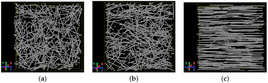 Figure 5. Realisations of the fibre model for different anisotropy parameters β . (a) β = 1 (isotropic); (b) β = 0.5 ; (c) β = 0.01 .