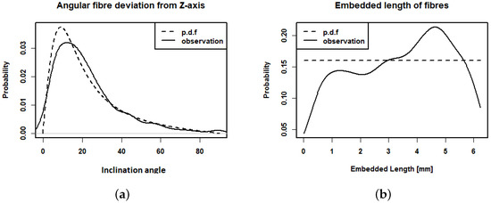 Figure 7. Observed inclination angle (a) and embedded length (b) of the fibres intersecting the crack (solid lines) and the corresponding fitted p.d.f. p c ( θ ) with β = 0.22 and p l e ( l ) (dotted lines).