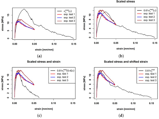 Figure 8. Prediction of composite stress σ c t ( ε ) by σ c t m e d ( ε ) (a) compared with three experimental tensile curves. Scaled σ c t m e d ( ε ) by stress scaling factor S u l t σ = 0.61 (b) and additionally scaled strain by strain scaling factor S u l t ε = 0.42 (c). (d) Prediction based on Equation (15).