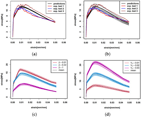 Figure 10. Prediction of M = 10 tensile curves (a) based on the CT scanned fibre system summarised in Table 3, (b) tensile prediction of 10 virtual specimens with fibre system generated by the stochastic fibre model from Section 2.6 with input parameters determined from the scanned fibre system. The predictions are compared with the three experimental tensile curves. (c) and (d) Tensile prediction of 10 virtual specimens with varied parameters. (c) β = 0.01 , 0.22 , 1 is varied and V V is fixed. (d) β is fixed and V V = 0.01 , 0.02 , 0.03 is varied. The mean of the tensile predictions per varied parameter is given as a dotted line.