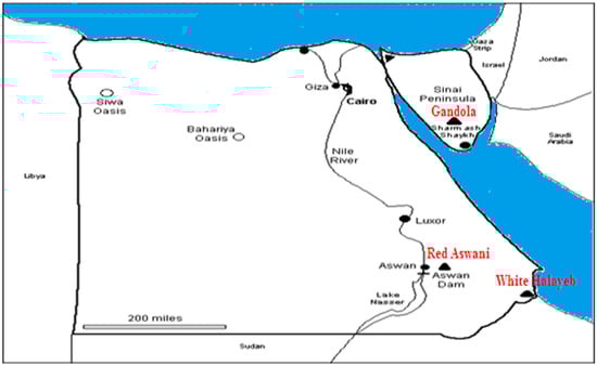 Three different natural granite types are shown in Table 1: Gandola, Red Aswani, and White Halayeb. The samples were collected from various places in Egypt, as shown in Figure 1. Five samples were obtained from each kind of granite rock. Small pieces of each type of granite were ground, and then the produced powder was stirred and mixed thoroughly until achieving a homogenous fine powder.