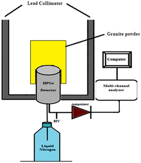Previous studies have demonstrated various detection and measuring techniques to determine the concentration of 40K and 238U in different environmental matrices [,,]. Gamma spectroscopy is the standard method used to measure the specific concentration of 40K in soil or natural rock due to the 40K gamma line at 1460.8 keV, with a considerable intensity of 10.66% []. On the other hand, alpha spectroscopy is a suitable method for directly determining specific 238U concentrations, but it suffers from complex chemical preparation and tracing methods prior to measuring. Hence, gamma spectroscopy dominates the detection process of 40K and 238U if the secular equilibrium between 226Ra (the last nongaseous daughter of 238U) is expected, as in the case of natural minerals and rocks such as granite [].