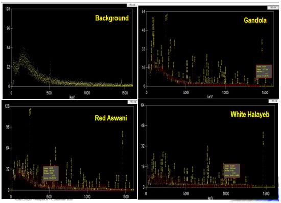 The minimum detectable activities of the radionuclides under study are listed in Table 3. The minimum detectable activity (MDA) of 40K was lower than the MDA of 226Ra. This might be due to the intensity of the 40K gamma line at 1460 (10.6%), which is higher than 226Ra at 186.2 keV (3.64%).