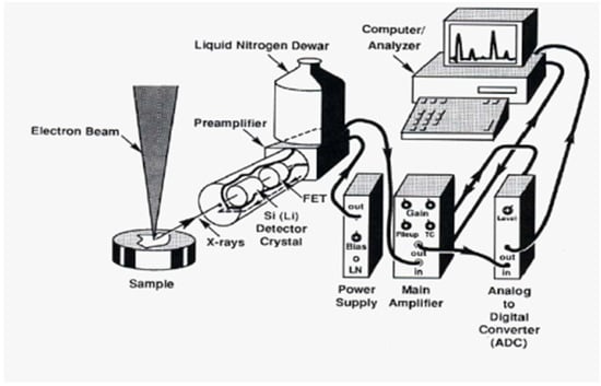 The elemental potassium and uranium concentrations of the investigated samples were determined through the energy dispersion X-ray (EDX) unit of the electron scanning microscope (SEM) at the city of scientific research in Alexandria, Egypt. Uranium is a trace element in granites, making accurate detection with EDX difficult. Therefore, each sample was scanned by the electron microscope for multiple scans (with repeated measurements), targeting different regions of one sample to perform a comprehensive scan for each sample. The measuring time was selected to be the maximum time allowed by the instrument (30 min), while increasing the beam current as much as possible to ensure the accurate determination of the elemental concentration inside the sample. A schematic diagram of an EDX micro-analysis method is shown in Figure 4 [].